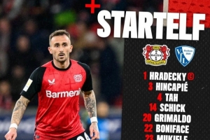 勒沃库森首发:1-赫拉德茨基、3-因卡皮耶、4-若纳坦-塔、14-希克、20-格里马尔多、22-博尼法斯、23-穆基勒、24-阿莱克斯-加西亚、25-帕拉西奥斯、30-弗林蓬、34-扎卡